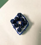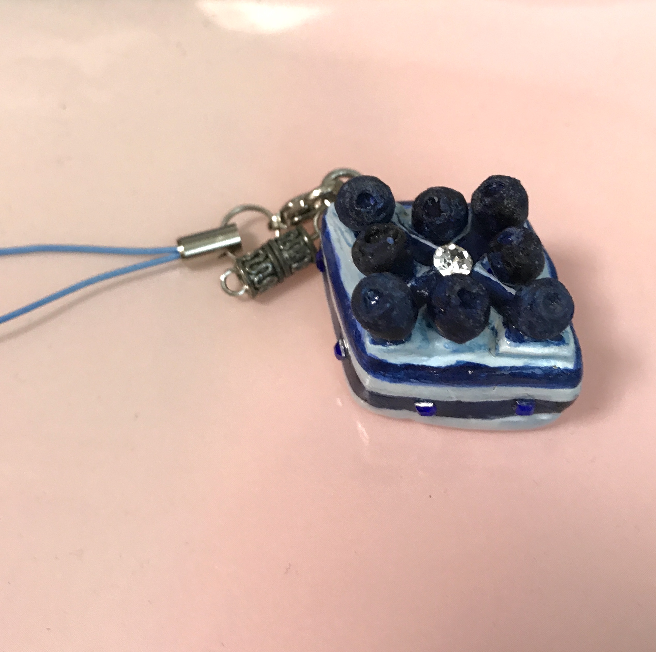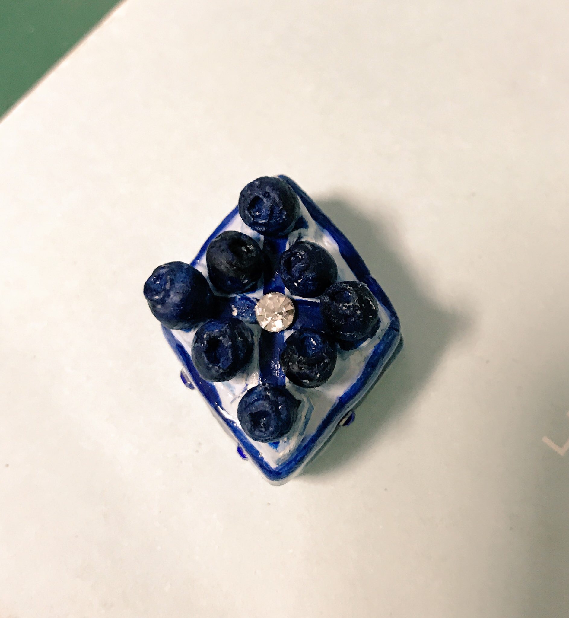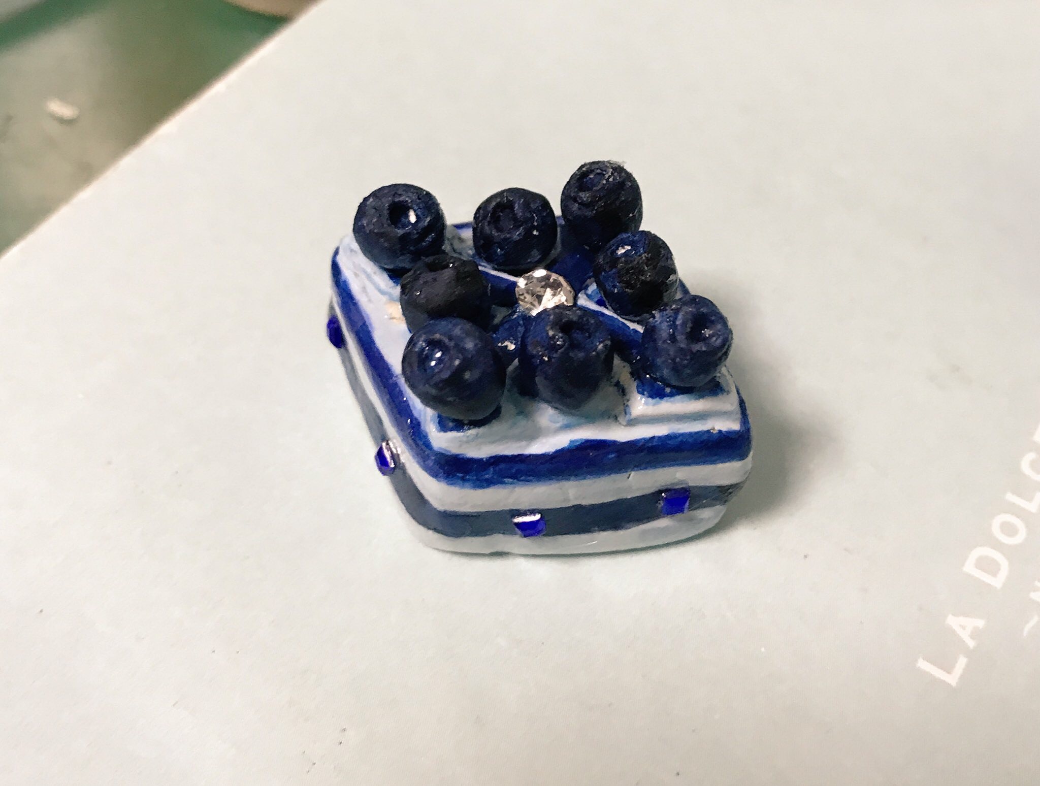 横から見たケーキのジャム部分には、中の果肉をイメージして、青いストーンを貼りました。